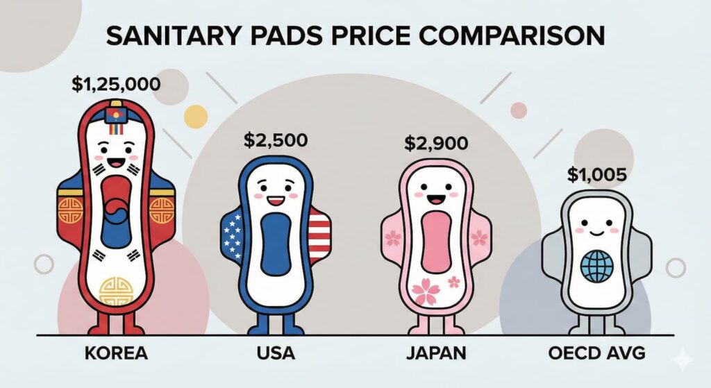 결론부터 말씀드리면, 비싼 건 사실입니다. 통계를 보면 한국 생리대의 개당 평균 가격은 약 375원입니다. 반면 일본은 175원, 미국은 210원, OECD 평균은 215원 수준이죠. OECD 평균보다 약 40%나 비싼 가격입니다.